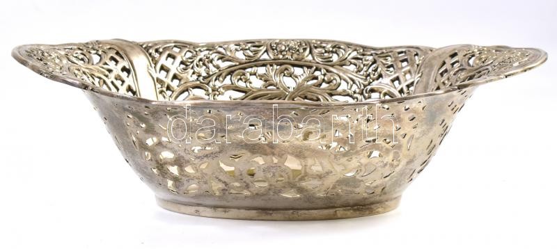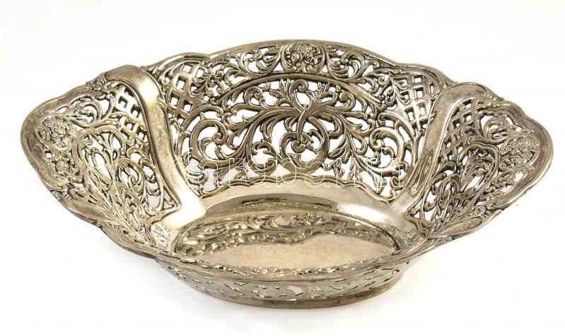 Díszes, áttört historizáló stílusú fém kínáló tál, apró kopásnyomokkal, m: 5,5 cm, 17×21 cm