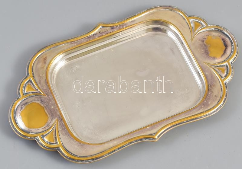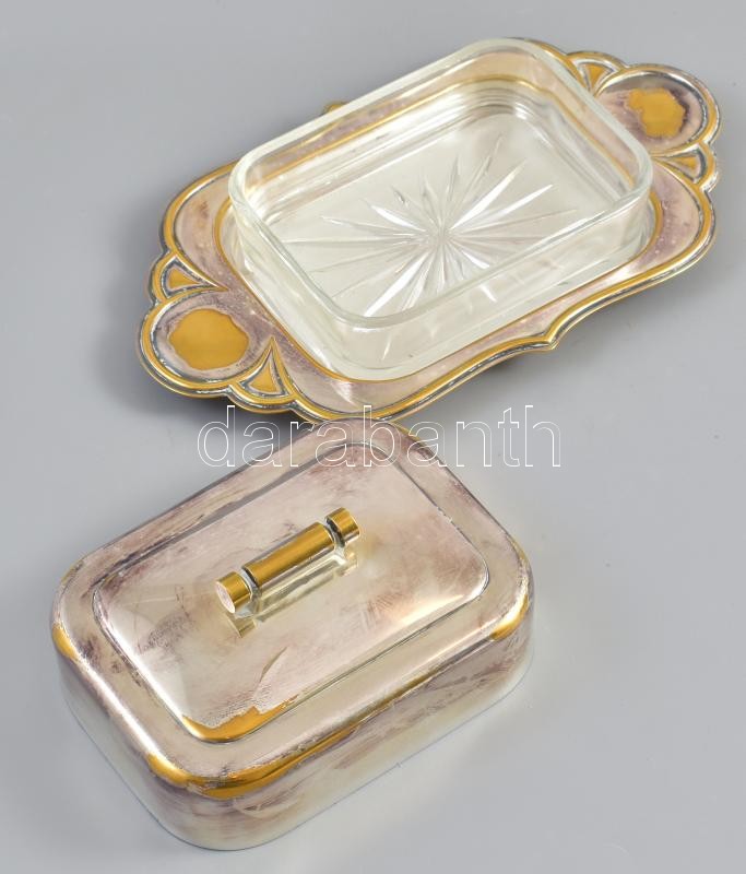 Ezüstözött fém vajtartó, üvegbetéttel, jelzett, kopásnyomokkal, 20×11 ...