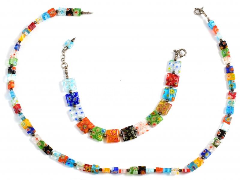 Színes virágmintás nyaklánc és karkötő, jelzett ezüst (Ag) szerelékkel...