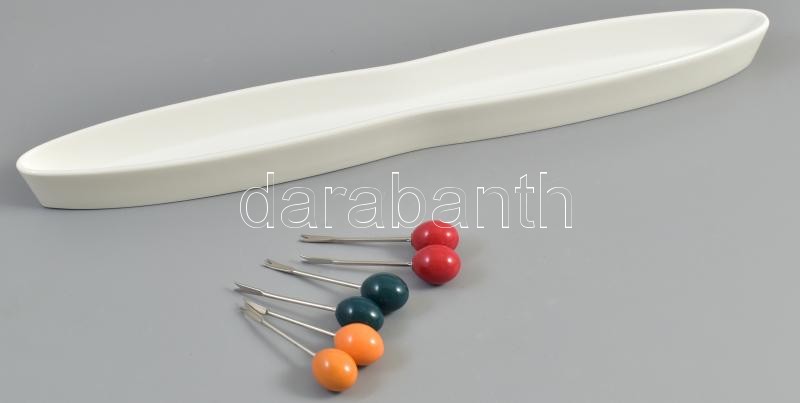 Tork porcelán olivabogyós tál, 6 db hozzá tartozó fém villával, eredeti dobozában. Matricás, hibátlan, 41x5x3 cm