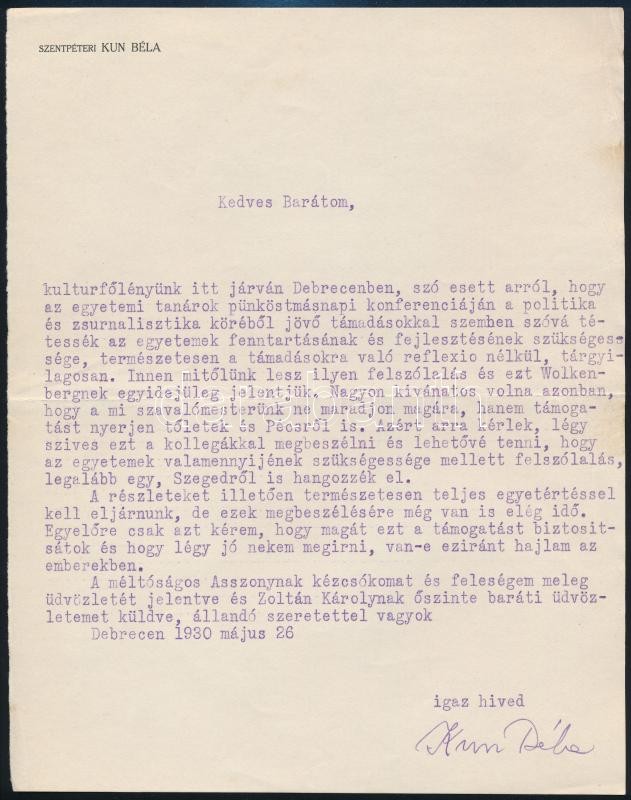 1930 Debrecen, Kun Béla (1874-1950) jogász, egyetemi tanár, debreceni egyetem rektorának gépelt levele, saját kezű aláírásával