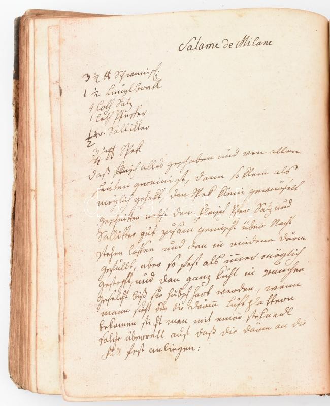 cca 1830 Szakácskönyv, receptgyűjtemény. 301 db kézzel írt recept közel 280 oldalon, német nyelven, hozzá tartlaomjegyzék, regiszter. Félbőr kötésben, kissé kopottas borítóval, belül nagyon szép állapotban, egy-két korabeli magyar bejegyzéssel / Cook-book, collection of recipes. Hand written in half leather binding. 24 cm