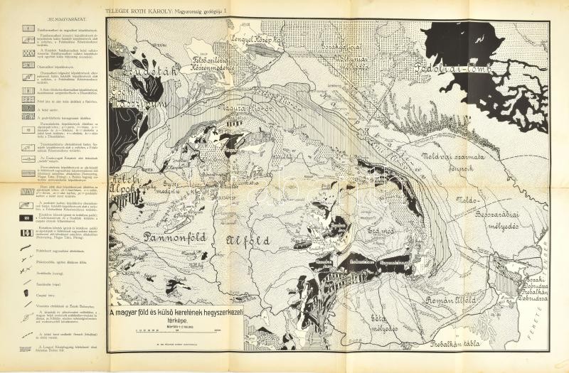 Description: 1929 A magyar föld és külső keretének hegyszerkezeti térképe, 1:2.1.00.000, In: Telegdi Roth Károly: Magyarország geológiája I., Bp., M. Kir. Földtani Intézet, javított, 45x69 cm