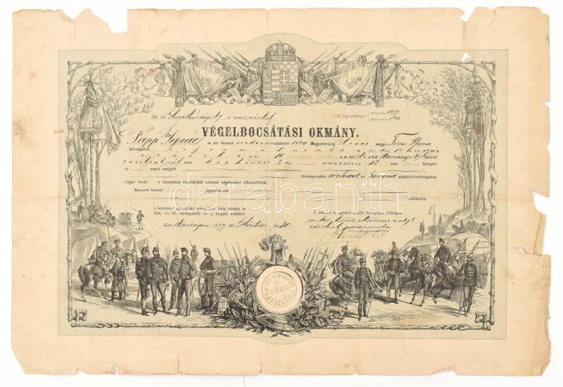 https://www.darabanth.com/en/395-Online-auction/395.0/Art-and-other-collectibles/Militaria~500028/1877-Diszes-illusztralt-cimeres-vegelbocsatasi-okmany-M-k-Heves-Kunsagi-47-zaszloalj~II2402497