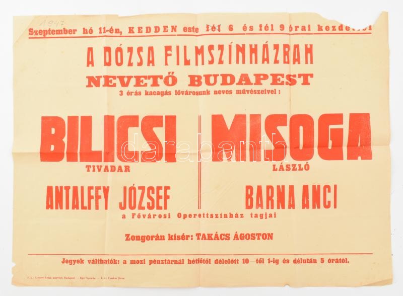 https://www.darabanth.com/en/395-Online-auction/395.0/Art-and-other-collectibles/Posters~2000020/1947-Dozsa-Filmszinhaz-Neveto-Budapest-c-kabare-plakatja-Bilicsi-Tivadar-Misoga-Laszlo-s~II2402475