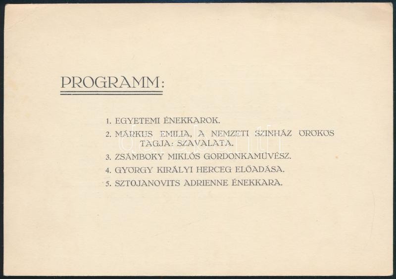 Description: 1933 György királyi herceg (György szász királyi herceg (1893-1943) modern kultúrproblémákról szóló előadásának belépője, rendező: Anna főhercegnő (1903-1976) védnöksége alatt álló Hitterjesztési Egyesület Női Bizottsága.