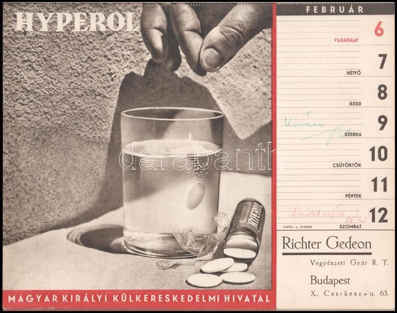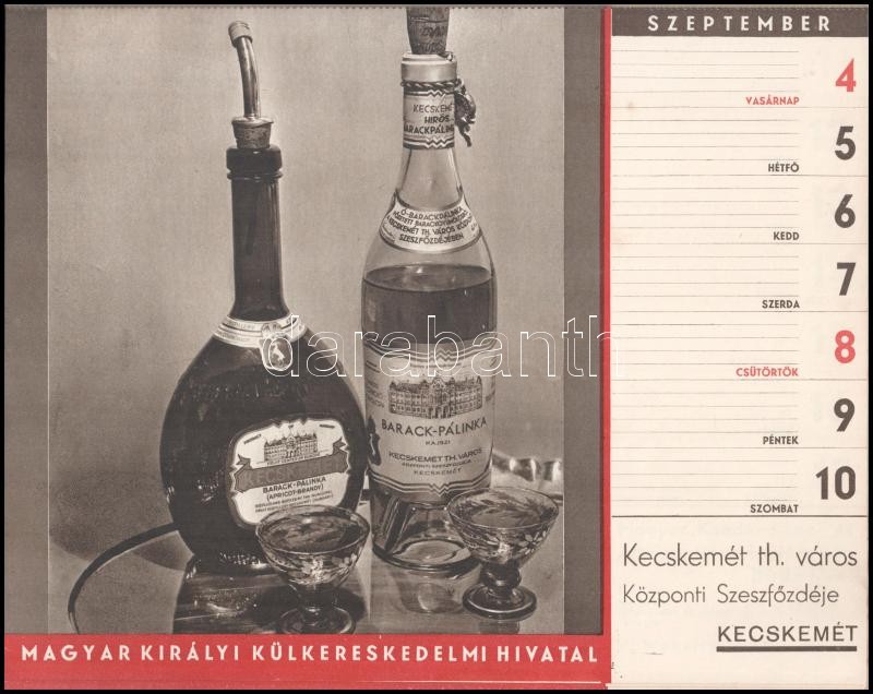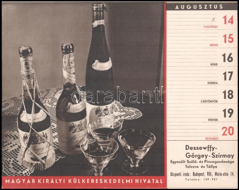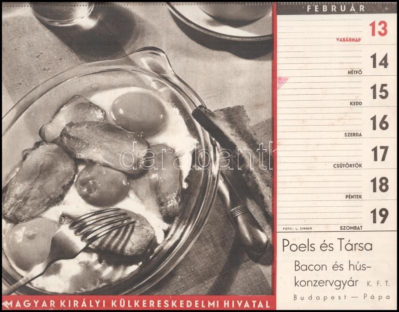 1938 Magyar Királyi Külkereskedelmi Hivatal 1938-as naptára, a borítón Klaudinyi László (1904-1984) grafikájával, benne számos magyar cég reklámjával, gazdag fekete-fehér reklám fotóanyaggal, a fotók között egy Pécsei József fotóval is. A naptár borítója leszakadt, az utolsó lap a perforáció mentén szakadt, az utolsó két hét hiányzik, dec. 17. az utolsó nap, 21x25 cm