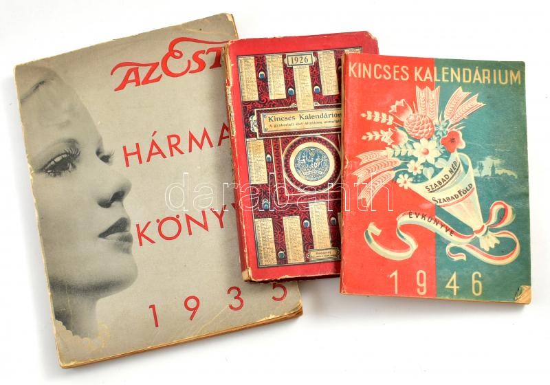 cca 1926-46 össz. 3 kalendárium: 1926 Kincses Kalendáriom. A gyakorlati élet általános útmutatója. XXX. évf. Bp., Rákosi Jenő Budapesti Hírlap Újságvállalata. Rengeteg korabeli reklámmal illusztrálva. Benne számos érdekes írással. Kiadói kartonált papírkötés, sérült gerinccel és borítóval. + 1946 A Szabad Nép és a Szabad Föld Kincses Kalendáriuma. Bp., 1946, Szikra. Több korabeli reklámmal illusztrálva. Benne számos érdekes írással. Kiadói papírkötés, sérült gerinccel és borítóval. + Az Est Hármaskönyve az 1935. H.n., 1935, Est Lapkiadó 272p. képekkel. Rengeteg korabeli reklámmal illusztrálva. Benne számos érdekes írással. Kiadói papírkötés, sérült gerinccel és borítóval, laza kötéssel.