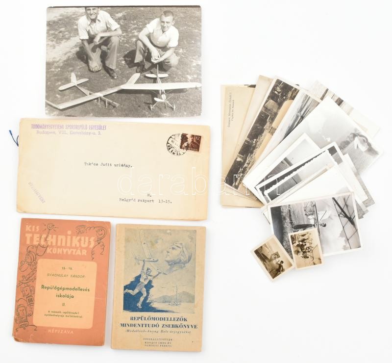 cca 1935-1960 Vegyes repüléssel kapcsolatos tétel (fotók-egyiken Micky egér ábrázolás, képeslap, meghívó, modellezésről szóló nyomtatvány)