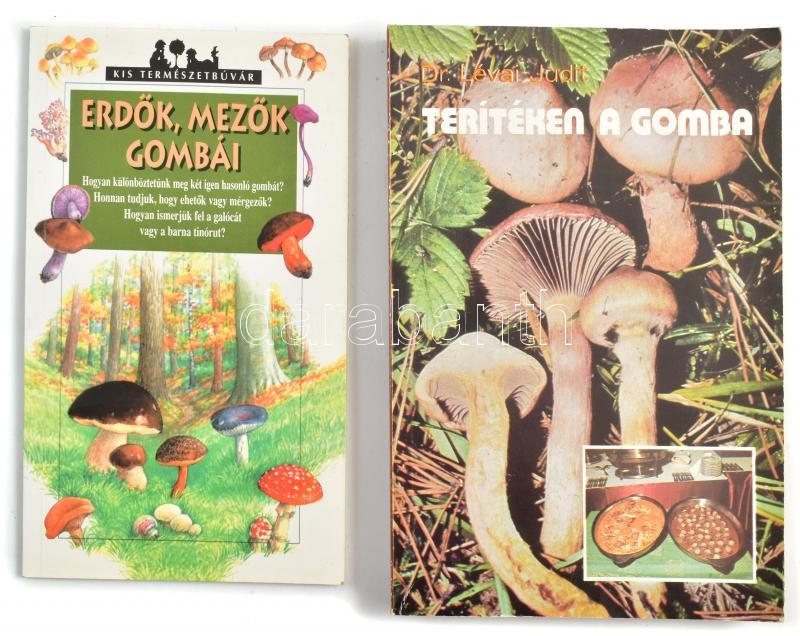 Lévai Judit: Terítéken a gomba. Bp.,1986, Medicina. Kiadói papírkötés. +Nicole Bustarret: Erdők, mezők, gombái. Héléne Appell-Mertiny illusztrációival. Kis Természetbúvár. Bp., 1996, Passage. Kiadói papírkötés.