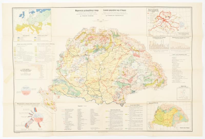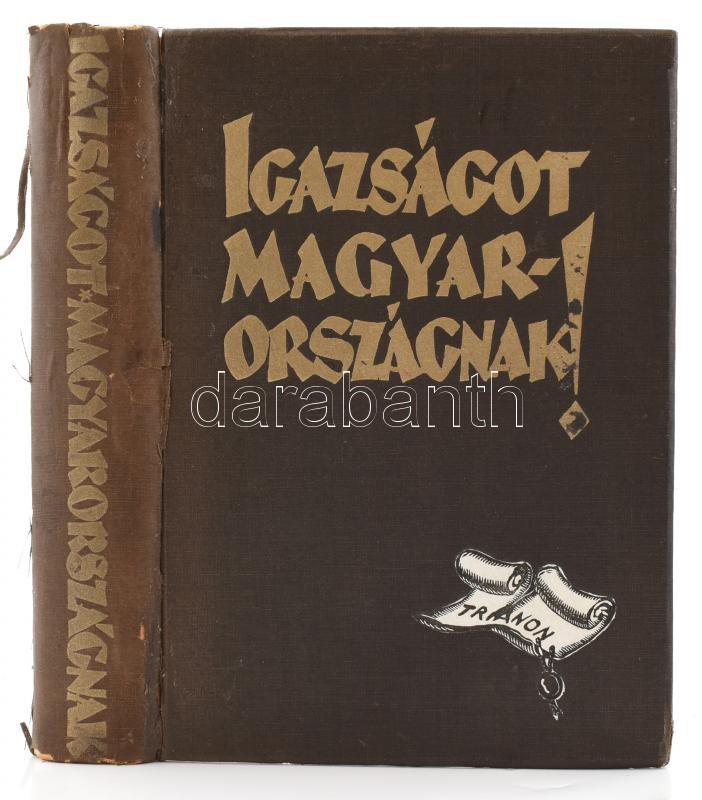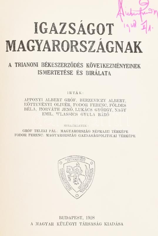 Apponyi Albert et al.: Igazságot Magyarországnak. A trianoni békeszerződés következményeinek ismertetése és bírálata. Bp., 1928, Magyar Külügyi Társaság,(Budapesti Hírlap-ny.), 8+402 p.+ 1 t. (térkép-melléklet: Magyarország gazdaságföldrajzi térképe, dr. Teleki Pál gróf, és dr. Cholnoky Jenő közreműködésével hivatalos adatok alapján szerk.: Dr. Fodor Ferenc, 1:1,500.000, Bp., Magyar Földrajzi Intézet Rt., III. kiadás, magyar és angol nyelven, a hajtások mentén kis szakadásokkal, 63x95 cm.) Első kiadás! Kiadói aranyozott egészvászon-kötés, kopott borítóval, sérült gerinccel, csak 1! térkép.