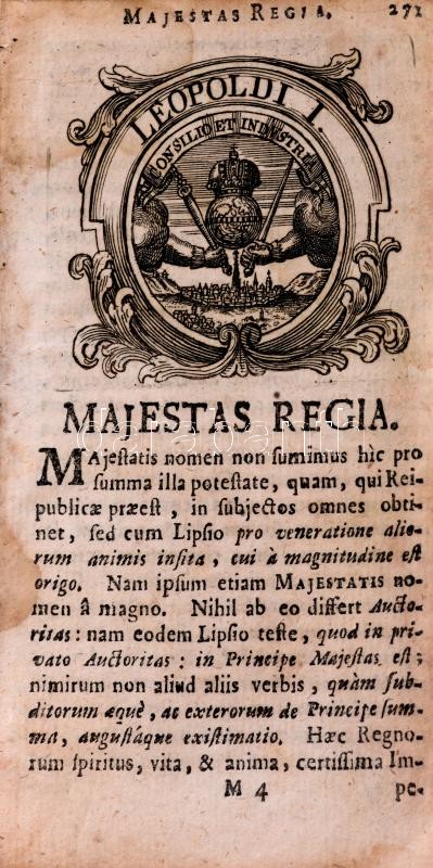 [Reichenau, Joseph (1685-1752)] Reichenau, Josepho: Virtutes Augustae Caesarum Austriacorum, adjectis eorundem Symbolis, et Institutionibus Politicis. Graecii [Gräz], 1725, Typis Haeredum Widmanstadius, 2 sztl. lev. +330 p. Latin nyelven. Rézmetszetű fejezetkezdő-, záró díszekkel. Korabeli egészbőr-kötésben, kopott, sérült borítóval, foltos lapokkal, 191/192. lapon hiánnyal, 12,5x7,5x3 cm
