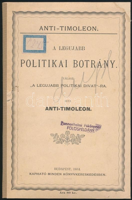 Anti-Timoleon A legujabb politikai botrány. Válasz ,,A legujabb politikai divat"-ra. Írta Anti-Timoleon. Bp., 1884. (Morvay és Mérei ny.) 67 + [1] p..A katolikus egyházat védő, politikai röpirat, válasz Beksics Gusztáv ,,Timoleon" álnéven megjelent művére. Szerzője ismeretlen. Kiadói papírkötésben, javított gerinccel
