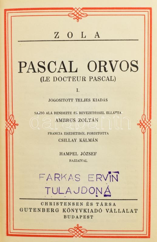 Emile Zola műveinek 6 kötete: A Föld I-IV. köt.; Pascal orvos I-III. köt., Álom; A pénz I-III. köt, Novellák. Bp., én., Christensen és Társa-Gutenberg. A címlap keretrajzát és a bekötést Végh Gusztáv iparművész, a plakettet Beck Ö. Fölöp szobrászművész tervezte. Kiadói aranyozott egészvászon sorozatkötésben, az elülső kötéstáblákon plakettel, változó állapotban, közte kopott borítókkal.
