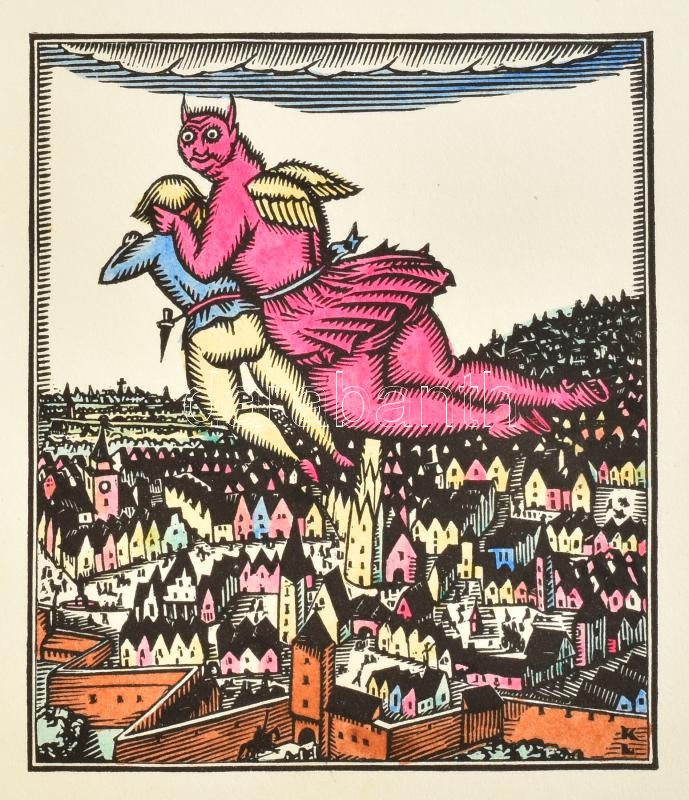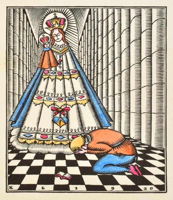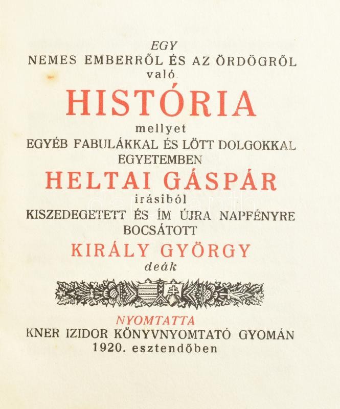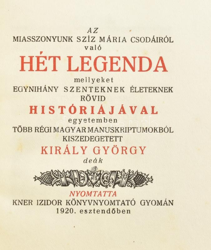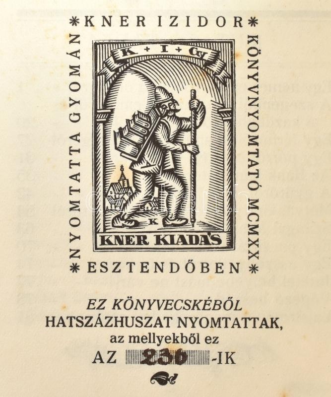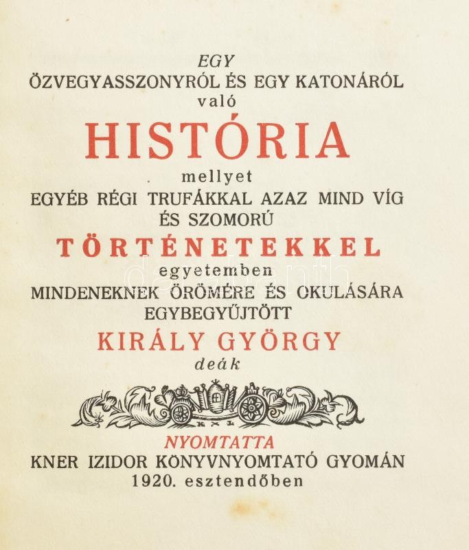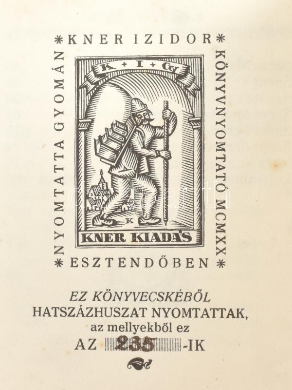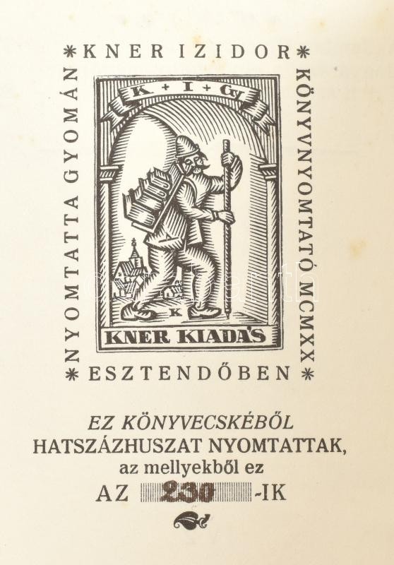 Három Csepke könyvek, I-III. I. Király György: Egy özvegyasszonyról és egy katonáról való história mellyet egyéb régi trufákkal azaz mind víg és szomorú történetekkel egyetemben mindeneknek örömére és okulására egybegyűjtött Király György deák. Király György utószavával. Gyoma, 1920, Kner Izidor, 4+83+1 p.+ 4 t. Kozma Lajos 4 egészoldalas, színezett, fametszetű illusztrációjával és könyvdíszeivel illusztrált. Számozott (230./620) példány.; II. Heltai Gáspár-Király György: Egy nemes emberről és az ördögről való história, melyet egyéb fabulákkal és lött dolgokkal egyetemben Heltai Gáspár írásaiból kiszedegetett és ím újra napfényre bocsátott Király György deák. Király György utószavával. Gyoma, 1920, Kner Izidor. 4+83+1 p.+ 4 t. Kozma Lajos 4 egészoldalas, színezett fametszetű illusztrációjával és könyvdíszeivel illusztrált. Számozott példány (236./620) példány.; III. Király György: Az Miasszonyunk Szíz Mária csodáiról való hét legenda mellyeket egynihány szenteknek életeknek rövid históriájával egyetemben több régi magyar manuskriptumokból kiszedegetett Király György deák. Király György utószavával. Gyoma, 1920, Kner Izidor, 4+83+1 p.+ 4 t. Kozma Lajos 4 egészoldalas, színezett fametszetű illusztrációjával és könyvdíszeivel illusztrált. Számozott példány (235./620) példány.; Mindegyikben Kozma Lajos 4 egészoldalas, színes fametszetű illusztrációjával és könyvdíszeivel illusztrált. A kézi színezést Kner Erzsébet és Kner Albert végezte. Első kiadások! Számozott példányok! Egységes kiadói kartonált papírkötésben, a III. köt. borítóját leszámítva az elülső kötéstáblákon narancssárga, fekete betűs címkékkel, festett felső lapélekkel, kissé kopott borítókkal, kissé foltos lapokkal.