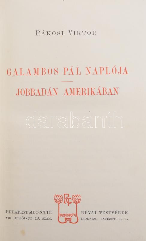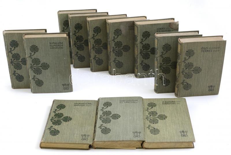Rákosi Viktor Munkái sorozat 12 kötete (2-5.,9-13., 16-18. kötetek): Elbeszélések és tárcák; A Buzsáki Királyság, KIárendált urak; A bujtogatók, Téli rege; Őszi termés; Polgárháború, Egy falusi Hamlet; Sipulusz humoros elbeszélései; IV Sipulusz humoreszkjei; XII Sipulusz humoreszkjei, Sipulusz humoros elbeszélései; Galambos Pál naplója, Jobbadán Amerikában; Korhadt fakeresztek; Emmy és egyéb elbeszélések. Bp., 1903-1911. Révai. Egységes, szecessziós levéldíszes zöld egészvászon Gottermayer-kötésben, márványozott lapszélekkel. Korhadt fakeresztek, Emmy és egyéb elbeszélések foltos, megviselt, sérült állapotban. Galambos Pál naplója kissé foltos borítóval és helyenként foltos lapokkal.