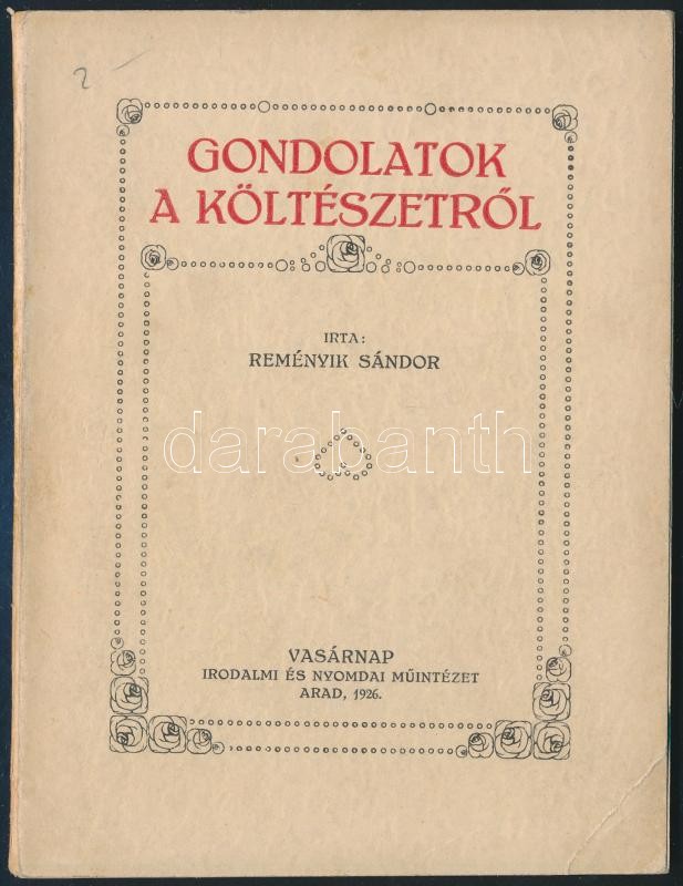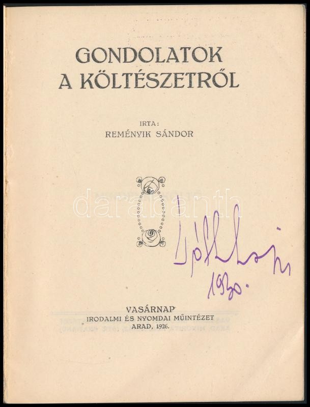 Reményik Sándor: Gondolatok a költészetről. Arad, 1926, Vasárnap, 62 p... https://www.darabanth.com/en/395-Online-auction/395.0/Books/Books-Other-rarities~1500021/Remenyik-Sandor-Gondolatok-a-kolteszetrol-Arad-1926-Vasarnap-62-p-Elso-kiadas-Kiadoi~II2400446