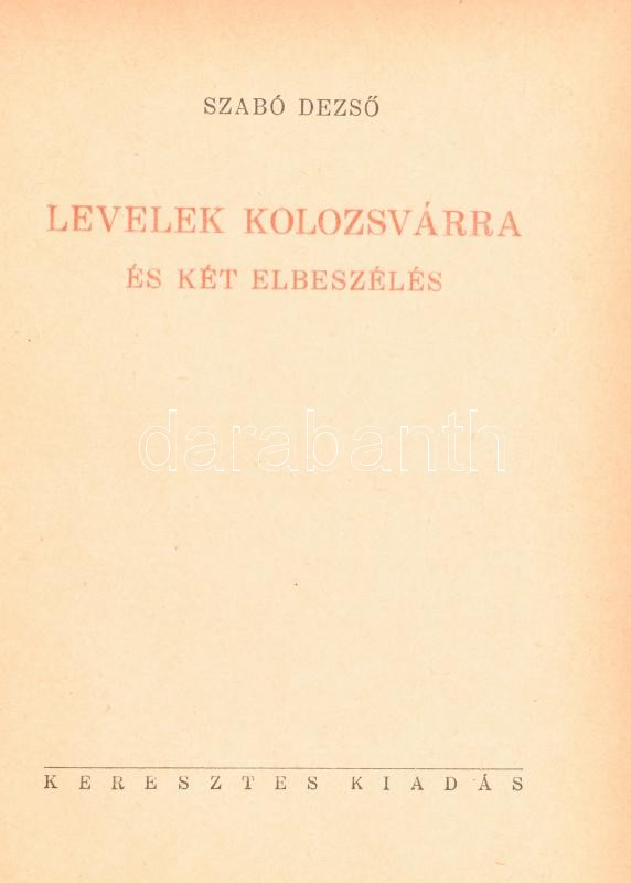 Szabó Dezső: Levelek Kolozsvárra és két elbeszélés. (Bp.), 1943, Keres... https://www.darabanth.com/en/395-Online-auction/395.0/Books/Books-Other-rarities~1500021/Szabo-Dezso-Levelek-Kolozsvarra-es-ket-elbeszeles-Bp-1943-Keresztes-Elso-kiadas-Ki~II2403246