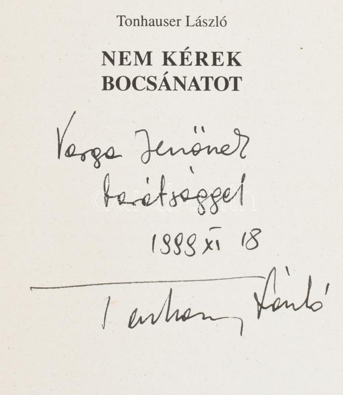 Tonhauser László: Nem kérek bocsánatot. A szerző által DEDIKÁLT példány. Bp., 1999, Totem. Kiadói papírkötés.