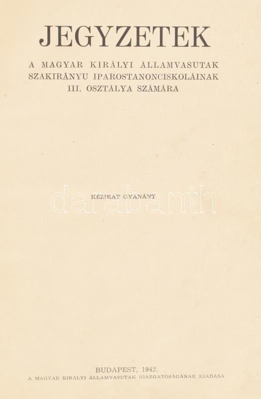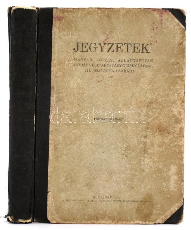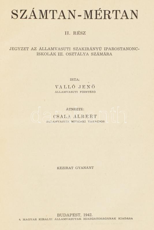 Jegyzetek az államvasúti szakirányú iparostanonc iskolák III. osztálya számára: Szacsvay Sándor: Magyarország története, 48 p.; Valló Jenő: Számtan-mértan. II. rész, 49-110 p.; Valló Jenő: Egészségtan, 111-153 p.; Dér Lajos: Technologia. II. rész, 155-295 p.; Csala Albert: Gyakorlati elektrotechnika I. rész, 297-361 p.; Csala Albert: Gépipari szakrajz, 363-411 p. Bp., 1942, M. Kir. Államvasutak Igazgatósága. Kiadói kopott, foltos, javított gerincű félvászon-kötésben.