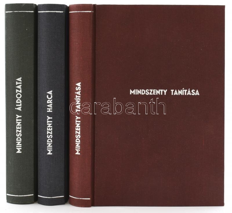 Mindszenty Okmánytár. Pásztorlevelek - beszédek - nyilatkozatok - levelek. I-III. köt.. I. köt.: Mindszenty tanítása. II. köt.: Mindszenty harca. III. köt.: Mindszenty áldozata. Sajtó alá rendezte: Vecsey József. München,1957, Ledermüller Olivér, 1 t.+317+3; 1 t.+367; 1 t.+383 p. Emigráns kiadás. Átkötött egészvászon-kötésekben, az eredeti papírborítókat bekötötték.