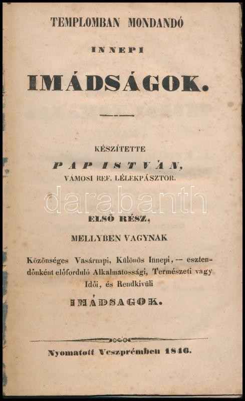 Pap István: Templomban mondandó innepi imádságok. Első rész, ... Készítette - -. Veszprém, 1846, nyn., 272+IV+2 p. Kopott félvászon-kötésben, foltos lapokkal.