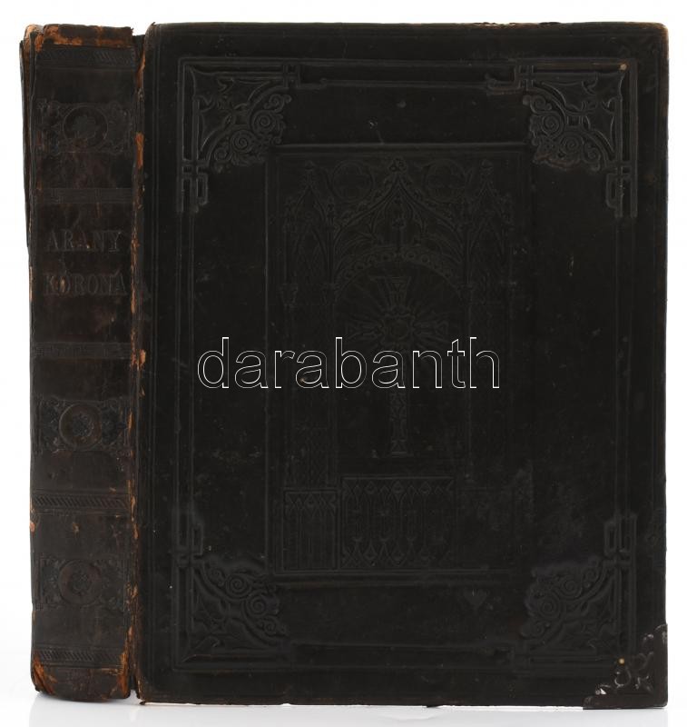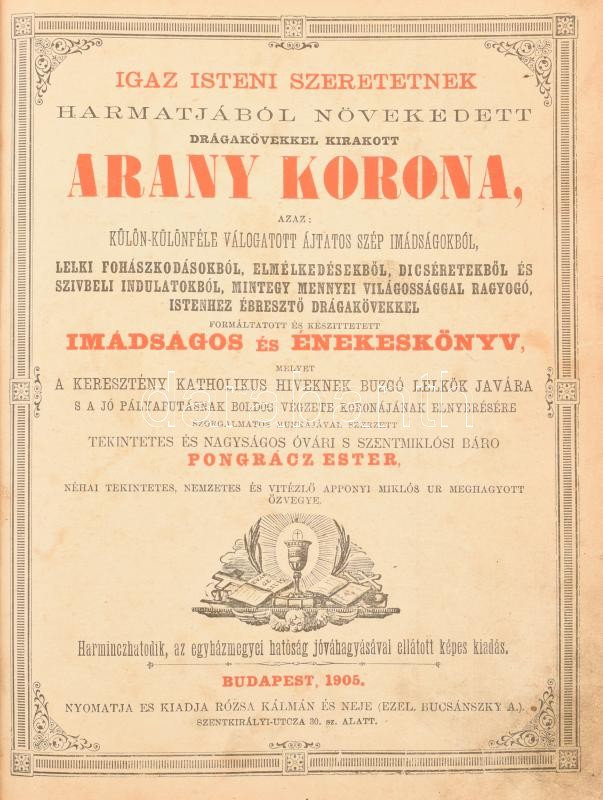 Pongrácz Eszter: Igaz isteni szeretetnek harmatjából nevelkedett drága kövekkel kirakott arany korona [...] imádságos könyv. Bp, 1905. Rózsa Kálmán. Korabeli díszes vakonyomásos egészbőr-kötésben, a sarkain fém veretekkel, kopott borítóval, kissé sérült gerinccel, a könyvtest kissé elvált a borítótól, javított kötéssel, az egyik sarkán a fém veret hiányzik, benne szakadozott lapokkal is, a végén egy-két egyházi aprónyomtatványal, egykorú bejegyzésekkel, megviselt állapotban-