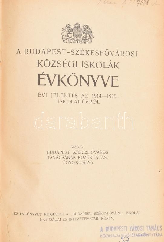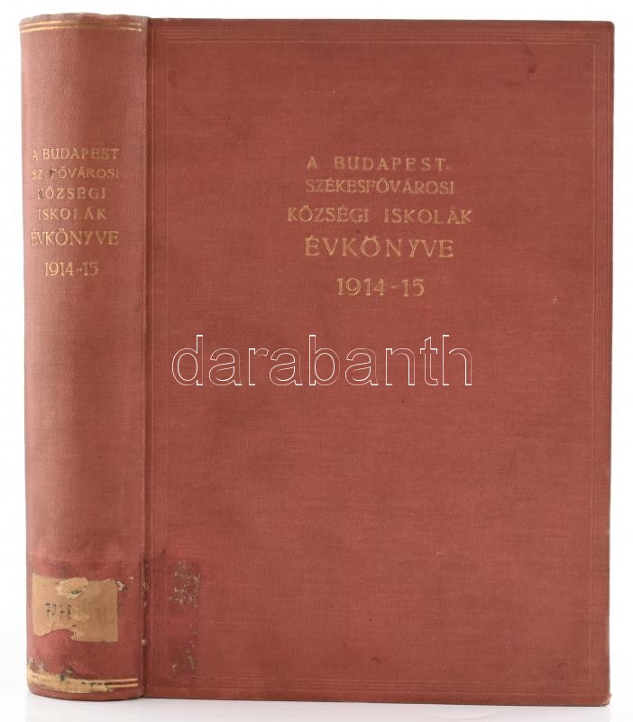 A Budapest-székesfőváros községi iskolák évkönyve évi jelentés az 1914-1915. iskolai évről. Kiadja: Budapest Székesfőváros Tanácsának Közoktatási Ügyosztálya. Bp., 1915, Wodianer F. és Fiai-ny., 938 p. Aranyozott kissé kopott, kissé foltos egészvászon-kötés, az elülső szennylap gyűrött, volt könyvtári példány.