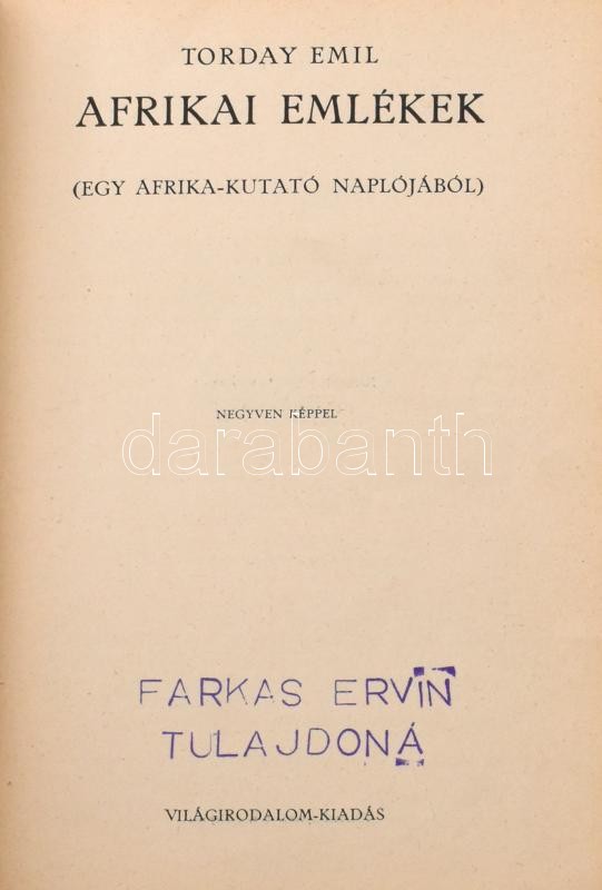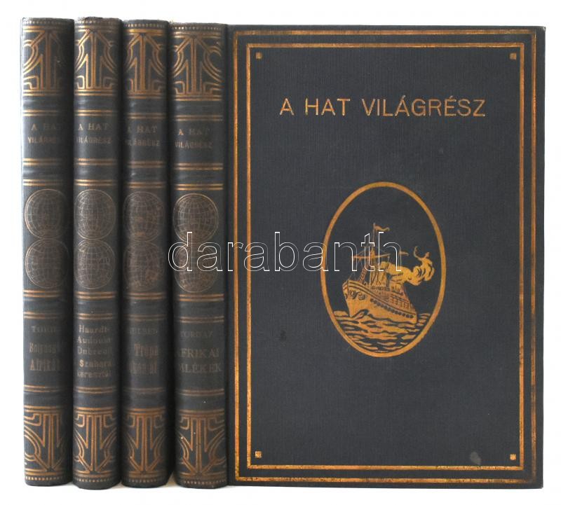 A Hat Világrész. Utazások és Fölfedezések c. sorozat 4 kötete (IV., XI:, XII. XIII.): Torday Emil: Bolyongások Afrikában. Három utazás az egyenlÃtÅ‘ vidékén. Fekete-fehér fotókkal, térképekkel illusztrált.; G. M. Haard-L. Audouin-Dubreuil: A Szaharán keresztül. A sivatag elsÅ‘ átszelése Citroen-automobilon (Touggourttól Timbuktuig.) Ford.: Ballenegger Róbertné -s Ballenegger Henrik. Fekete-fehér fotókkal illusztrált.; Aage Krakup Nielsen: A trópusokon át a Déli Jeges tengerre. (Cetvadászok útja.) Ford.: Baktay Ervin. Fekete-fehér fotókkal illusztrált. Torday Emil: Afrikai emlékek. (Egy Afrika-kutató naplójából.) Szövegközti fekete-fehér fotókkal illusztrált. Bp.,én.,Világirodalom. Kiadói aranyozott egészvászon-kötés, a borÃtókon kis kopásnyomokkal, tulajdonosi névbélyegzÅ‘kkel, de alapvetÅ‘en jó állapotban