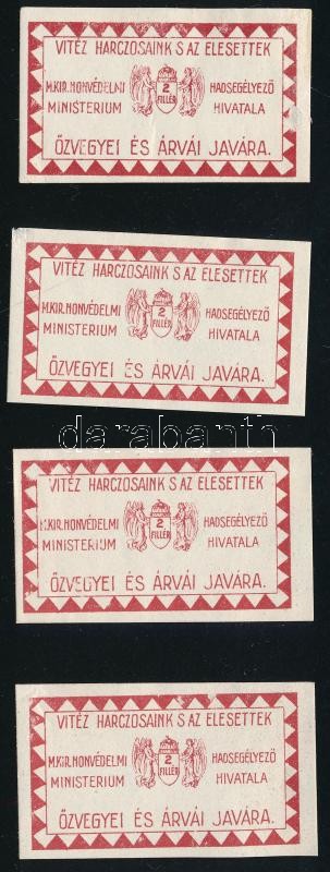 cca 1914-1918 2f M. Kir. Honvédelmi Minisztérium Hadsegélyező Hivatala "Vitéz harcosaink s az elesettek özvegyei és árvái javára" segélybélyeg, 4 db