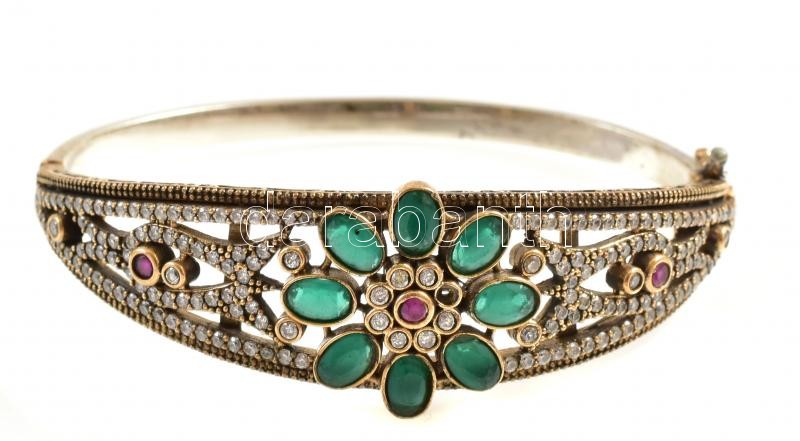 Aranyozott ezüst(Ag) karperec, virágos motívummal, kövekkel gazdagon kirakva, jelzett, 5×6 cm, bruttó: 23,3 g