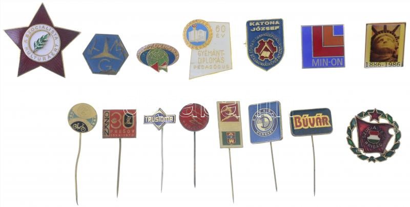 Description: Vegyes 15db-os szocialista jelvény és kitűző tétel, közte "A szocialista kultúráért" zománcozott jelvény, "Gyémántdiplomás Pedagógus" műgyantás jelvény, "Katona József Ipari Szakközépiskola és Szakmunkásképző Intézet" T:vegyes