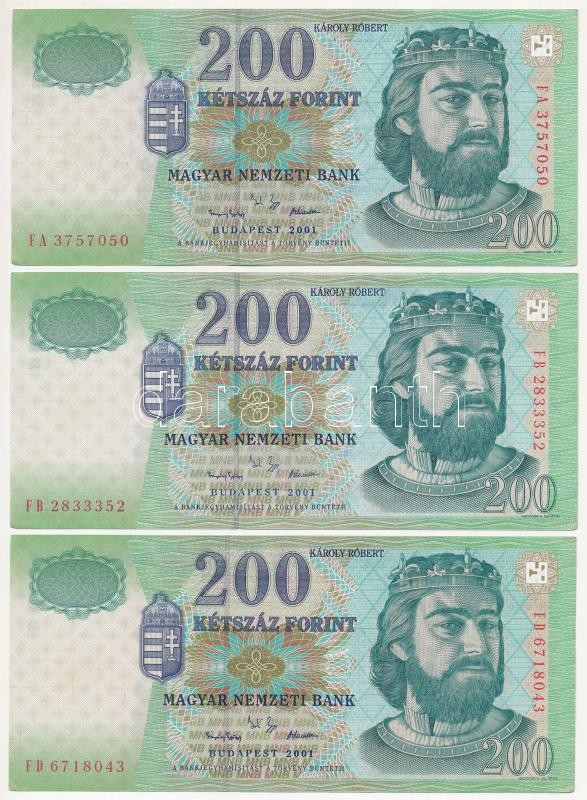 2001. 200Ft "FA 3757050" + 200Ft "FB 2833352" + 200Ft "FD 6718043" T:II