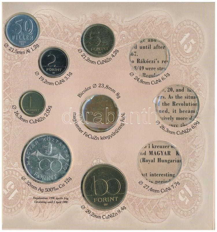https://www.darabanth.com/en/395-Online-auction/395.0/Numismatics/Hungarian-coins-and-coins-with-Hungarian-mint-marks~2000008/1997-50f-200Ft-6xklf-HIANYOS-forgalmi-sor-benne-200Ft-Ag-Deak-plus-1998-100Ft-alpakka-1848-18~II2398403