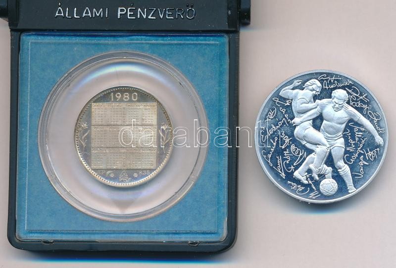 1980. Jelzett ezüst naptárérem "Állami pénzverő" feliratú műanyag tokban (0.835/24mm) + Bognár György (1944-) 1986. "Labdarúgó VB-Mexikó" ezüstözött fém emlékérem T:PP patina, ujjlenyomatos