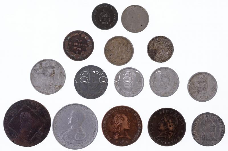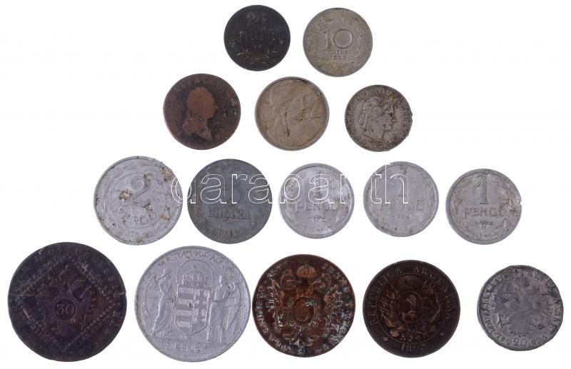 Description: 15db klf magyar és külföldi fémpénz, közte 1800B 6kr Cu + 1835B 20kr Sn hamisítványa + Argentína 1893. 2c Br T:vegyes
