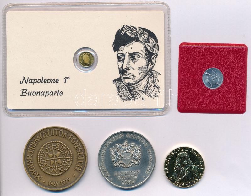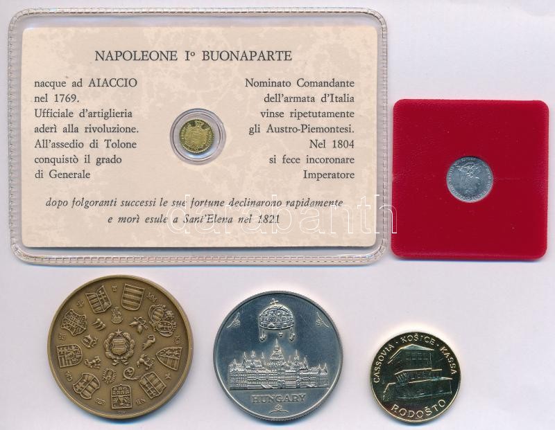Vegyes 5db-os érme és emlékérem tétel, közte DN "Bonaparte Napóleon" jelzetlen modern mini Au pénz, lezárt, eredeti műanyag tokban (0.333/10mm) T:1-2