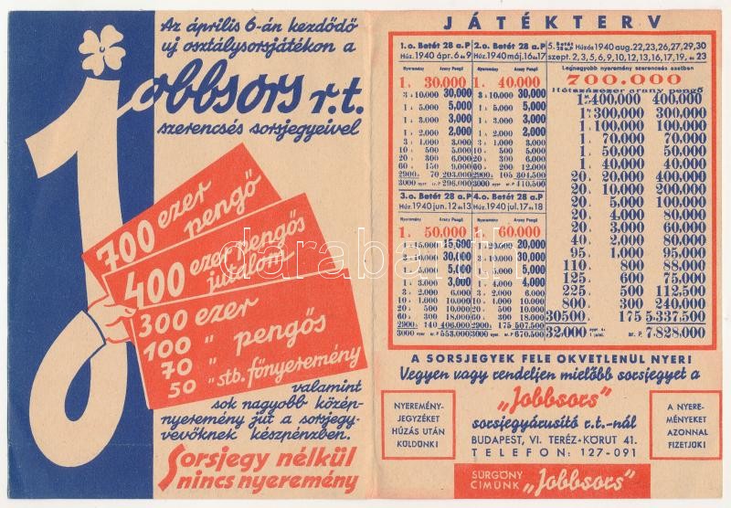 1940. "Jobbsors R.t." sorsjegyárusltó cég játékterve, rendel...