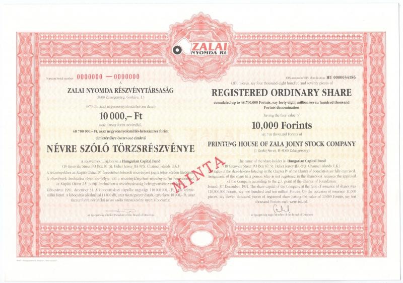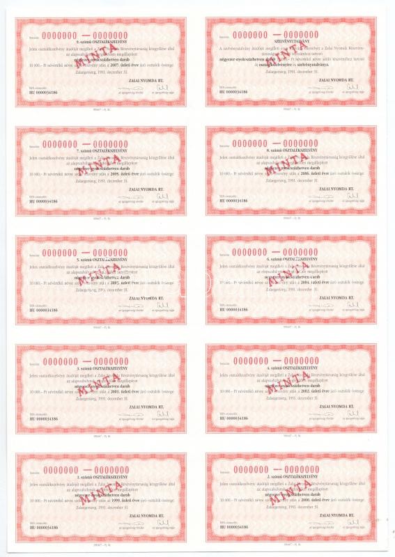 1999. "Zalai Nyomda Részvénytársaság" 2000db névre szóló törzsrészvénye egyben, egyenként 10.000Ft-ról, kétnyelvű, "MINTA" bélyegzéssel, szelvényekkel T:I