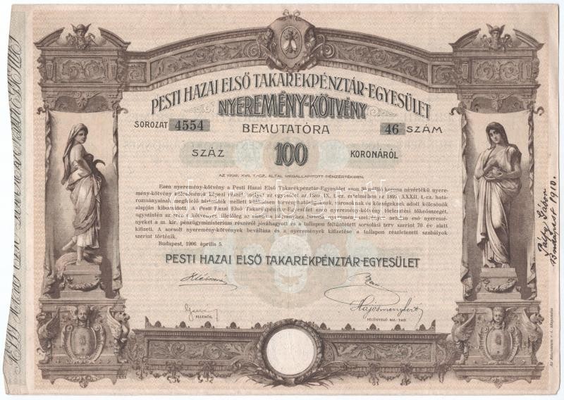 https://www.darabanth.com/en/395-Online-auction/395.0/Numismatics/Shares-and-Tickets~2000005/Budapest-1906-Pesti-Hazai-Elso-Takarekpenztar-Egyesulet-100K-rol-szolo-nyeremenykotven~II2397189