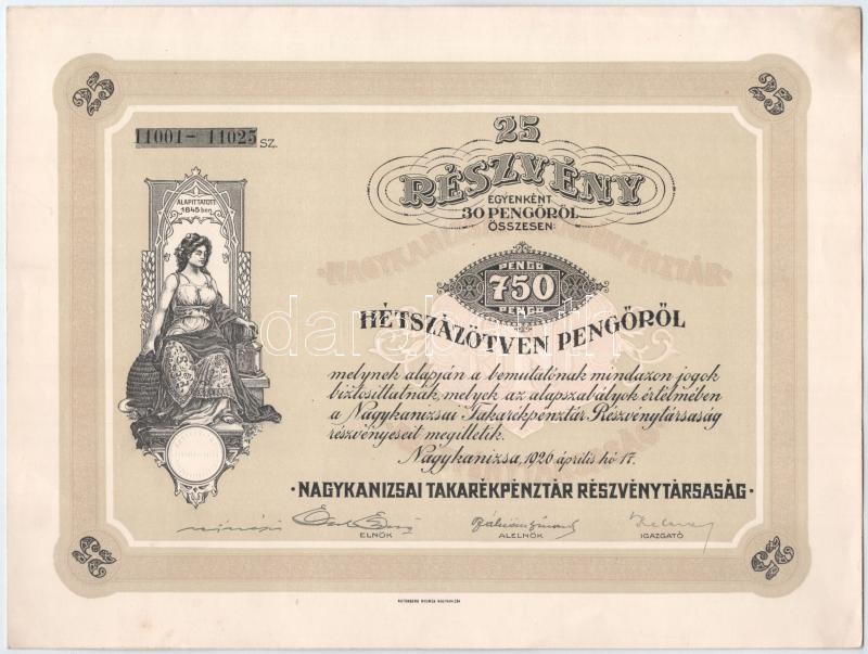 https://www.darabanth.com/en/395-Online-auction/395.0/Numismatics/Shares-and-Tickets~2000005/Nagykanizsa-1926-Nagykanizsai-Takarekpenztar-Reszvenytarsasag-25-reszvenye-egyben-ossz~II2397723