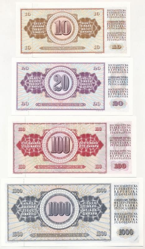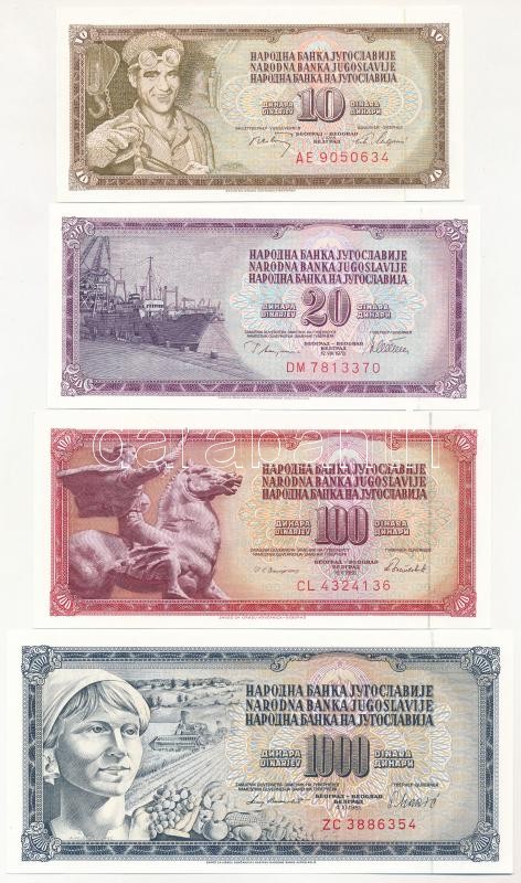 Yugoslavia 1968. 10 Dinara + 1978. 20 Dinara + 1981. 1000 Dinara + 1986. 100 Dinara C:UNC,AU