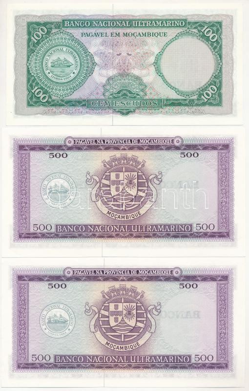 Description: Mozambik 1961. 100E fekete "BANCO DE MOCAMBIQUE" + 1967. 500E fekete "BANCO DE MOCAMBIQUE" felülbélyegzéssel (2x) T:I