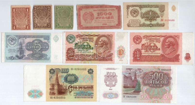 https://www.darabanth.com/en/395-Online-auction/395.0/Numismatics/Worldwide-banknotes~2000013/Szovjetunio-1919-1-plus-2plus-3R-plus-1921-1000R-plus-1961-1-plus-10R-plus-1991-5-plus-10-plus-100R-plus-1992-500R-TI-II~II2402365