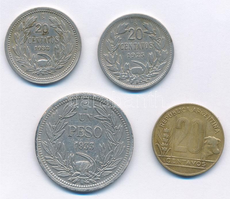 Chile 1925-1932. 20 Centavos Cu-Ni (2xklf) + 1933. 1 Peso Cu-Ni + Argentina 1949. 20 Centavos Al-Br T:2,2-