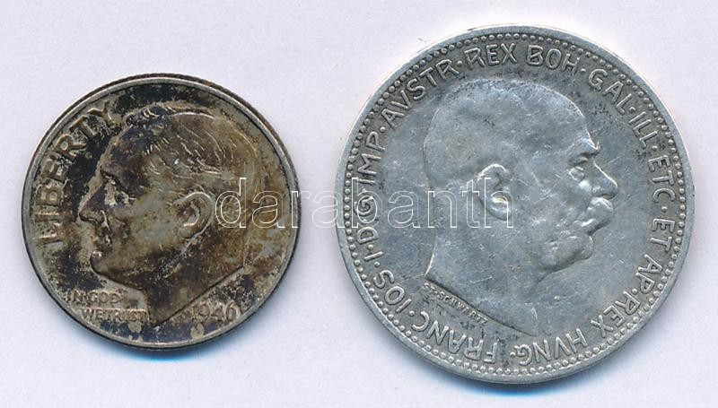 Description: Vegyes: Amerikai Egyesült Államok 1940. 10c Ag + Ausztria 1915. 1K Ag "Ferenc József" T:2,2- patina