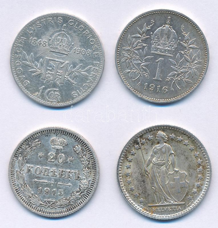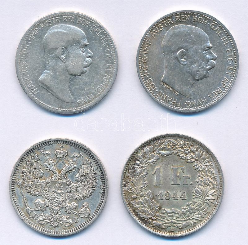 Description: Vegyes: Ausztria 1908. 1K Ag "Ferenc József - Jubileum" + 1916. 1K Ag "Ferenc József" + Orosz Birodalom 1915BC 20k Ag "II. Miklós" + Svájc 1944B 1Fr Ag T:2,2-