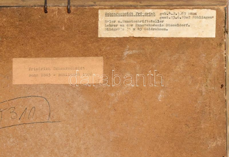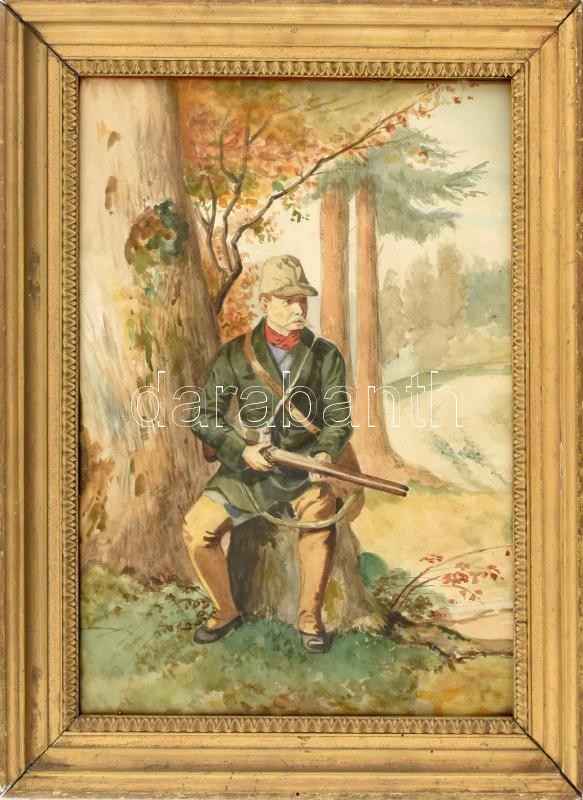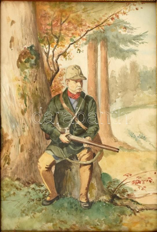 Friedrich Schaarschmidtnak (1863-1902) tulajdonított: Vadász puskával. Akvarell, ceruza, papír. Jelzés nélkül. Hátoldalán címkéken feliratozott. Üvegezett, kissé laza fa keretben. 41x28,5 cm
