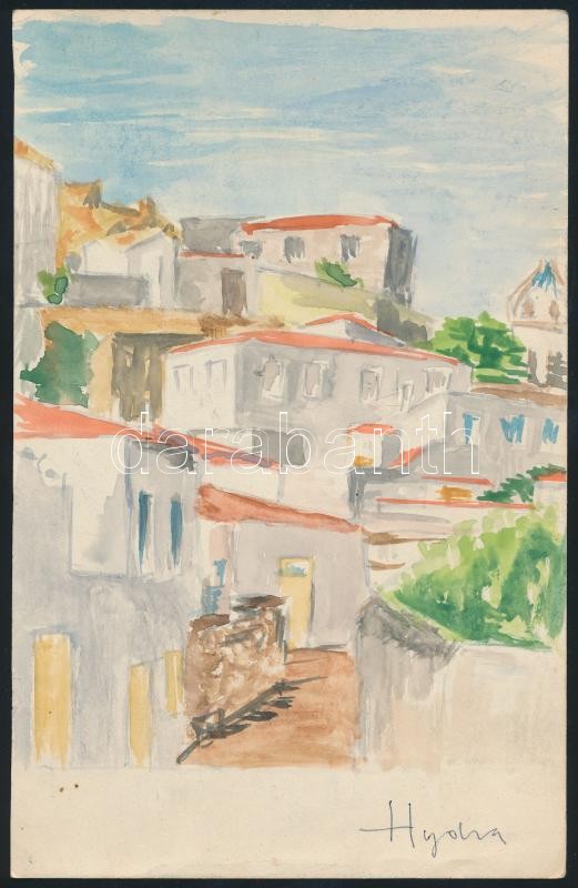 Jelzés nélkül, 2 db görögországi helyszínt megörökítő vízfestmény: Hyd...