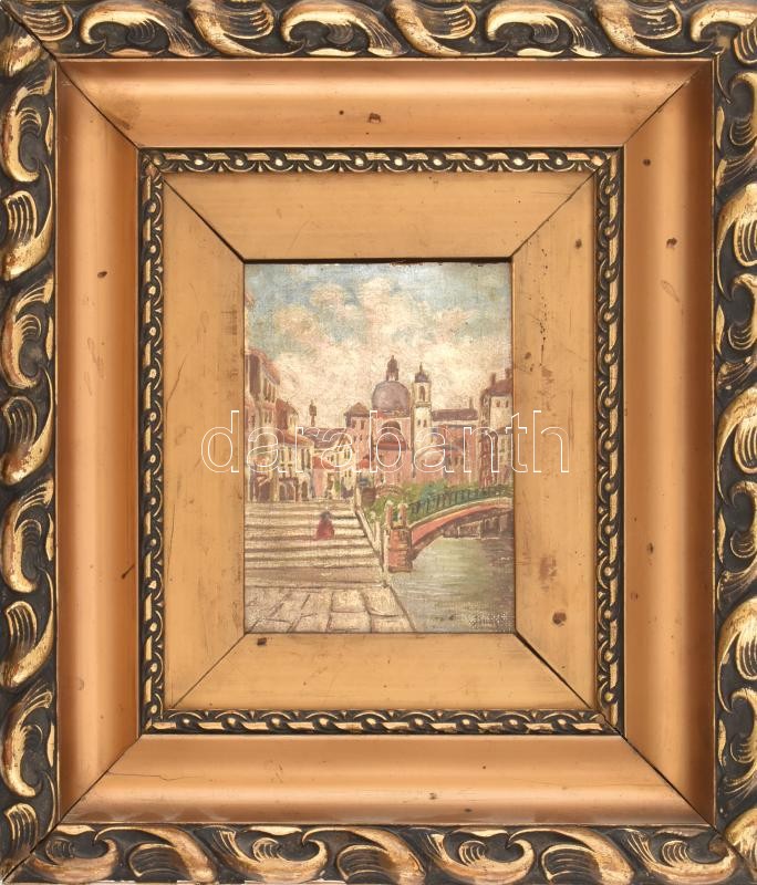 Olvashatatlan jelzéssel: Városrészlet. Olaj, vászon. Dekoratív, kissé sérült fa keretben. 14x10 cm